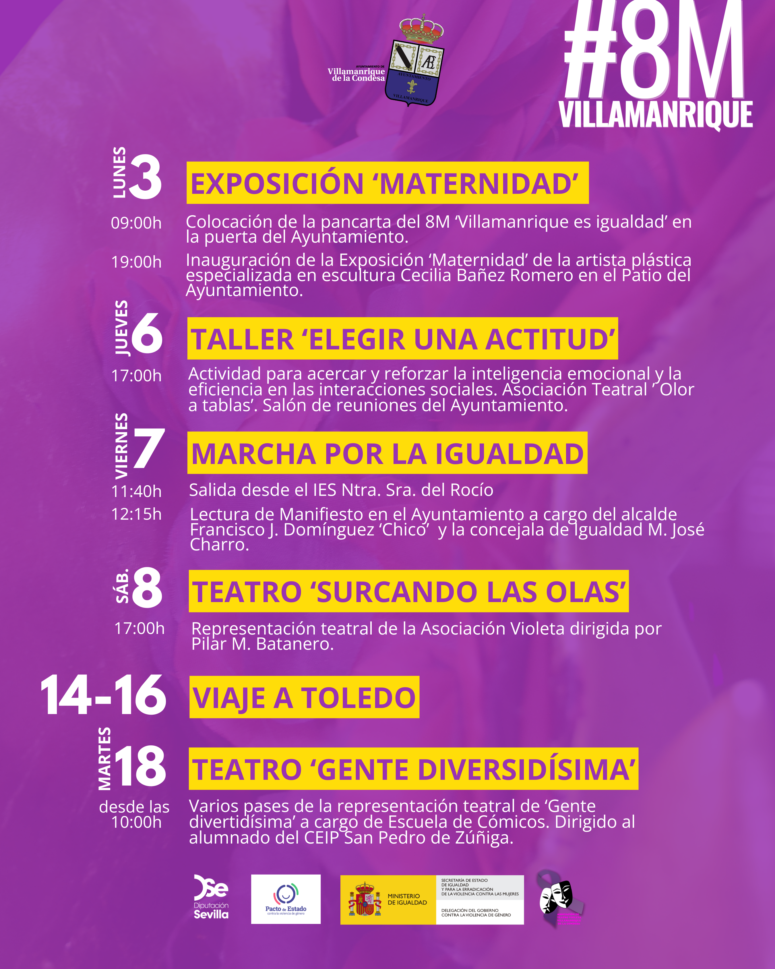 Se acerca marzo, mes violeta por antonomasia en la agenda municipal, y el Ayuntamiento de Villamanrique, a través de la concejalía de Igualdad y la colaboración de la concejalía de Cultura, ha preparado una completa y variada agenda de actividades que comenzará el día 3 y se extenderá hasta el 18 de marzo.