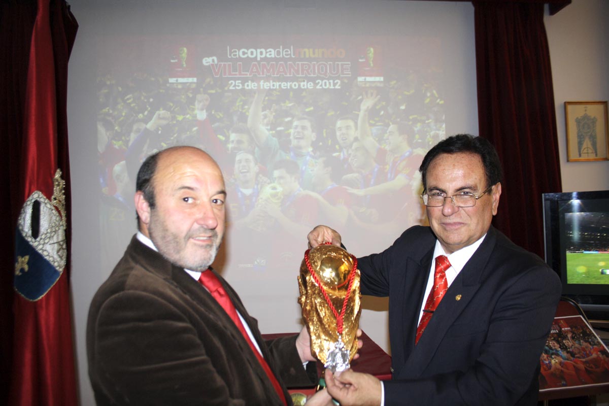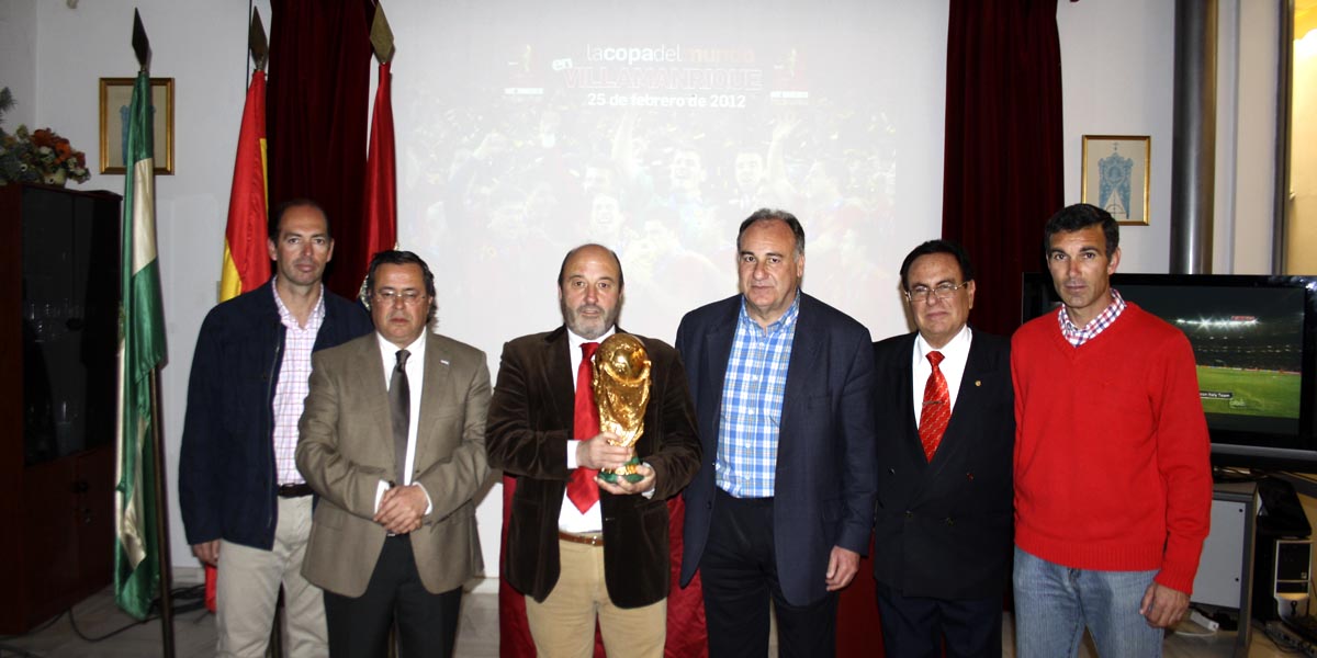 La Copa del Mundo de Fútbol visitó el pasado sábado 25 de febrero el municipio de Villamanrique de la Condesa, que pudo disfrutar de este trofeo conseguido por la Selección Española en el mundial celebrado en 2010 en Sudáfrica. El trofeo se expuso en el Salón de Actos del Ayuntamiento, que se abrió para una ocasión en la que cientos de vecinos acudieron a fotografiarse con la preciada copa.