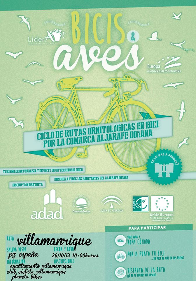 El sábado 26 de octubre Villamanrique de la Condesa vivirá una divertida actividad para toda la familia, la Ruta Ciclista 'Bicis & Aves', organizada por el GDR Aljarafe Doñana y el Ayuntamiento de Villamanrique de la Condesa, con la colaboración del Club Ciclista Villamanrique y la tienda de bicicletas Planeta Bikes.